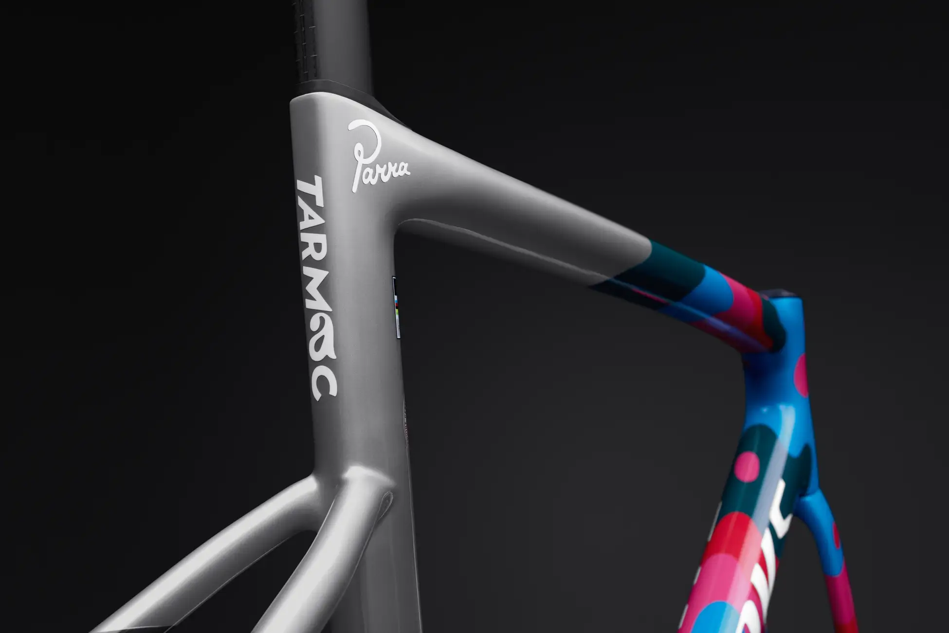 パラにとってサイクリングはスピードを伴う自由。雑音を消し去り、創造性を研ぎ澄ませる儀式のような存在です。長年Tarmacに乗ってきた彼は、自分の愛車の延長線としてデザインを構築。90年代のサイクリングカルチャーをルーツに、彼の象徴的な丸みのある手描きスタイルで創り上げました。多層に隠されたタイポグラフィやモチーフが、色の渦を駆け抜けるような疾走感と高揚感を体現しています。